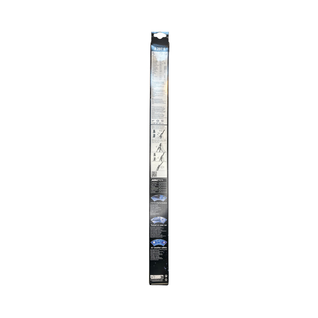 Der Bosch AeroTwin A297 S überzeugt durch die bewährte Flachblatt-Technologie. Er sorgt für gleichmäßiges, streifenfreies Wischen auf der Frontscheibe und garantiert zuverlässige Performance bei jeder Witterung.